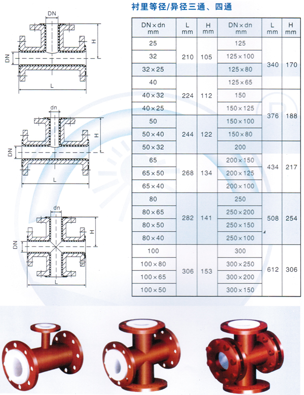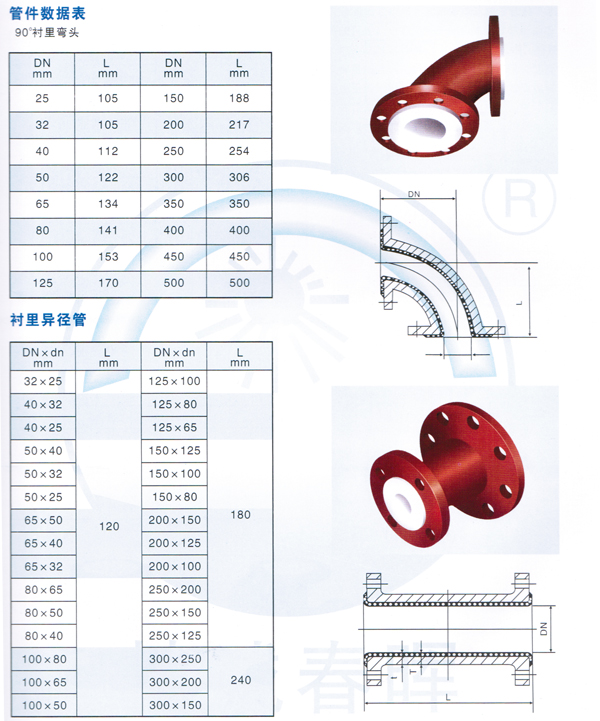 其管配件采用氟塑料(PTFE、PFA、FEP或PVDF)為原料,經(jīng)模壓成形,襯里厚度3—4.5mm,具有優(yōu)良的耐正、負(fù)壓能力。