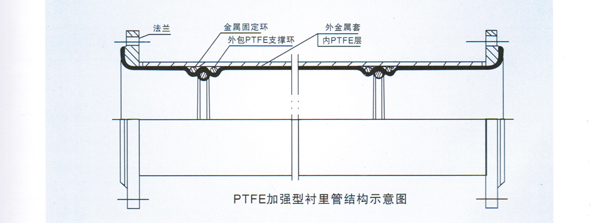 制造工藝:先將若干層PTFE薄膜纏繞在模具上,再將鋼絲(+0.5—1mm)螺旋形地纏繞在PTFE薄膜上,然后在鋼絲外面再纏繞若干層PTFE薄膜,最后放在爐中燒結(jié)成形。用這種工藝制作的PTFE襯里管,內(nèi)壁光滑,外壁由于鋼絲的體積及其外彈力量,形成螺旋形淺波紋。將它襯入鋼管內(nèi),并在PTFE襯里管外壁與鋼管內(nèi)壁之間的空隙處罐滿填充樹脂(排出殘留空氣)。這種填充樹脂能與鋼管緊密粘在一起。同時(shí),它能緊緊地包裹在螺旋形的PTFE襯管外壁上。填充樹脂固化后,就形成了與襯里外壁波紋相咬合的螺旋形波紋:這種結(jié)構(gòu),類似于螺母與螺栓的結(jié)合。它一方面能使PTFE襯里的熱脹冷縮得到有效的限制和補(bǔ)償;另一方面,利用鋼絲的剛度明顯地提高PTFE襯里耐負(fù)壓的能力。