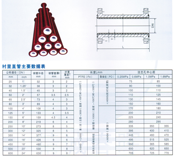 襯里直管主要數(shù)據(jù)表